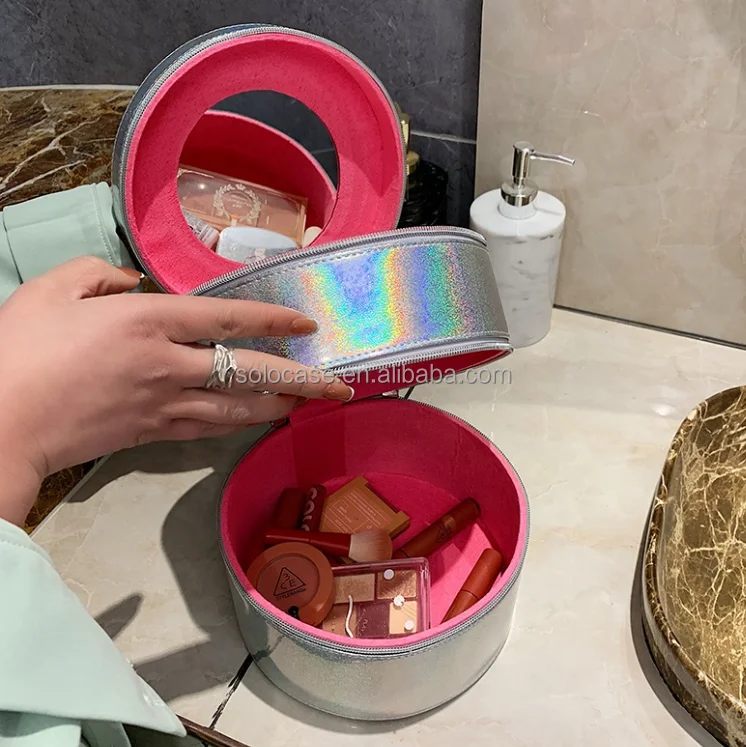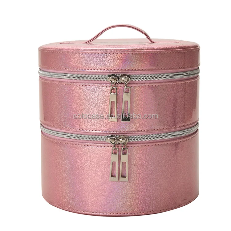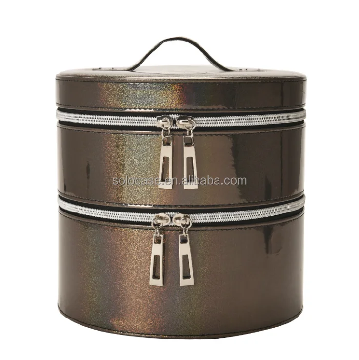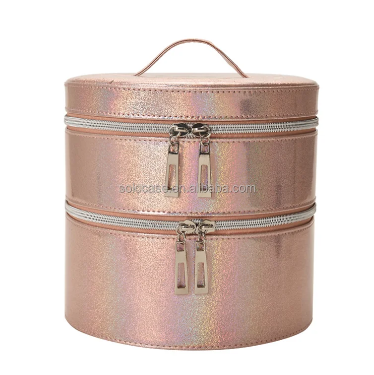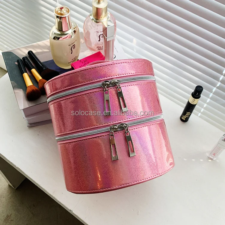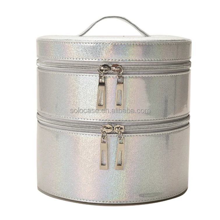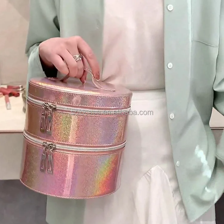 Women Double Layer Travel Holographic Makeup Bag with Strap Large Cosmetic Case Organizer